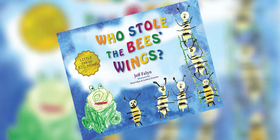 In Who Stole the Bees’ Wings?, author Jeff Falyn and mother-daughter illustrators Dezla Falyn and Lyndsay Dawkins have created an enchanting and amusing book sure to captivate young children and the adults that read to them. The story begins as Blue Flower tells Frog that the bees are gone; without the bees, she cannot make seeds, and the food chain will become disrupted. In a classic cautionary tale style, Frog sets forth on an adventure to find Know-It-Owl and to solve the problem of the missing bees. It turns out that the bees are not missing at all; somebody has stolen their wings. But who?